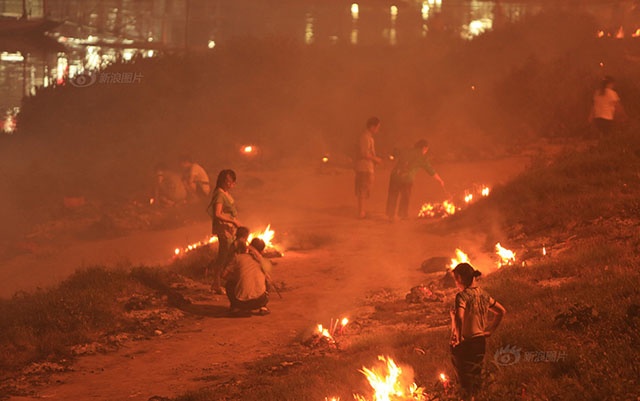 | Các gia đình đốt lửa và thắp hương dọc bờ sông Zhouhe. Lễ hội Ma trong tháng cô hồn diễn ra vào ngày 15/7 âm lịch. Theo truyền thống, người dân Trung Quốc thắp hương, đốt vàng mã bên ngoài nhà hay dọc các con đường để cúng tổ tiên và các linh hồn lang bạt t. |