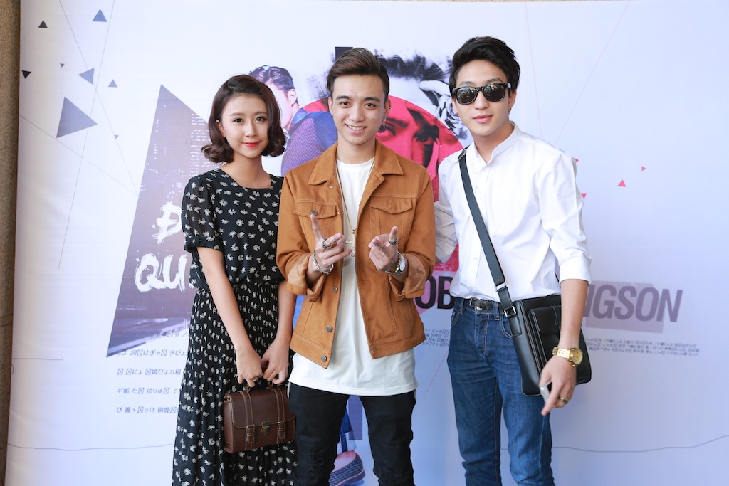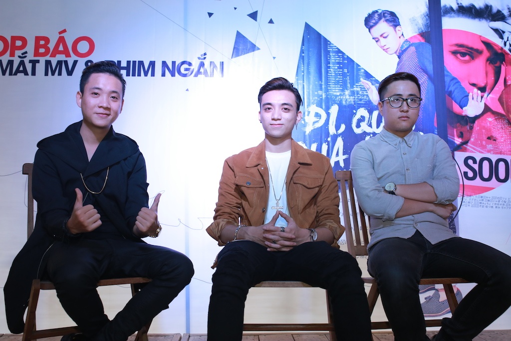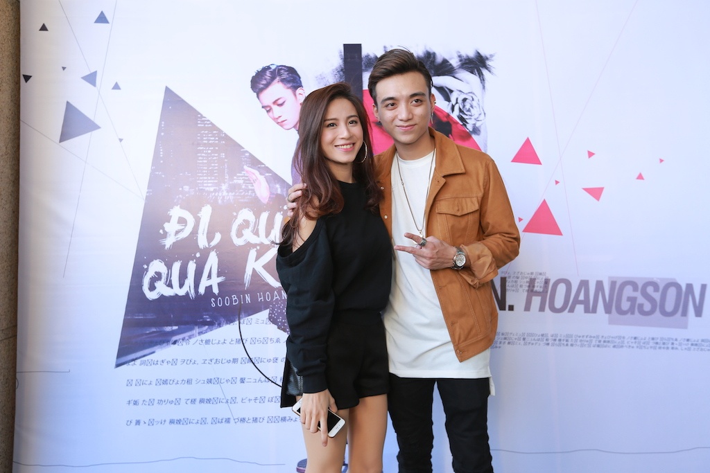 | Soobin Hoàng Sơn chụp ảnh với người anh em thân thiết JustaTee. Giọng ca Forever Alone và bạn gái - hot girl Trâm Anh - đã cùng với Soobin thực hiện phim ngắn mang tên Đi qua quá khứ. Nhiều khán giả khi xem bộ phim đi kèm MV của Soobin trong ngày họp báo đã bất ngờ trước khả năng diễn xuất của bộ ba này.