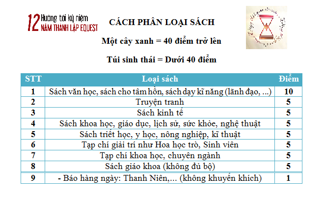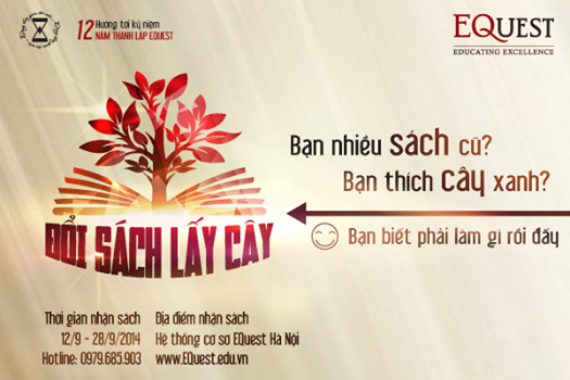 Các chương trình đổi sách lấy sách, đổi sách lấy cây, quyên góp sách lập thư viện vẫn được nhiều bạn trẻ đón nhận và hào hứng tham gia. Nếu bạn không muốn đổi lấy cây xanh, bạn có thể mang sách đến đổi tại quầy đổi sách EQuest Book Box. Đây là dự án của EQuest phối hợp cùng Book Box Việt Nam, nhằm nâng cao văn hóa đọc cho giới trẻ. Bạn sẽ được lấy bất cứ cuốn sách nào, và chỉ cần để lại một cuốn sách cùng thể loại cho Book Box, vừa tiết kiệm tiền mua sách, vừa chia sẻ niềm vui đến cho mọi người.