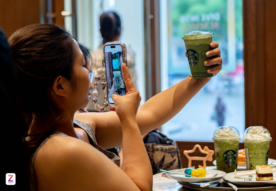 Thực khách chụp ảnh ly nước tại cửa hàng Starbucks Bưu điện Hà Nội. Ảnh: Châu Sa. |