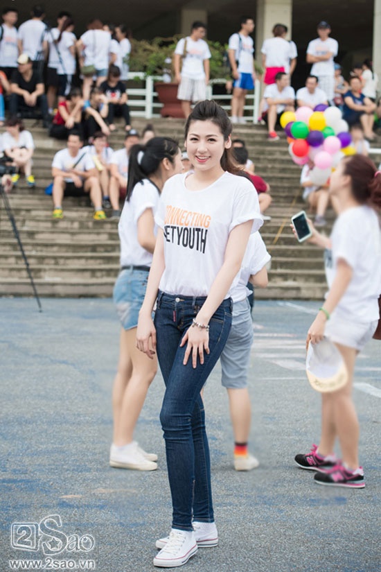 | Tú Anh giản dị, năng động với áo phông, quần jeans và giày thể thao khi tham gia hoạt động xã hội. |