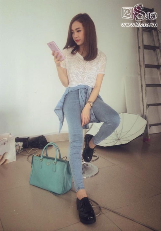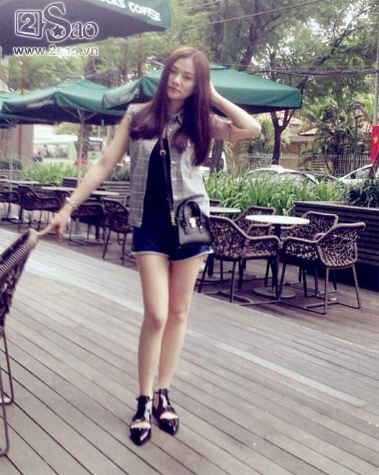 | Minh Hằng cá tính với cả cây denim, cùng giày màu đen. |