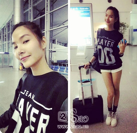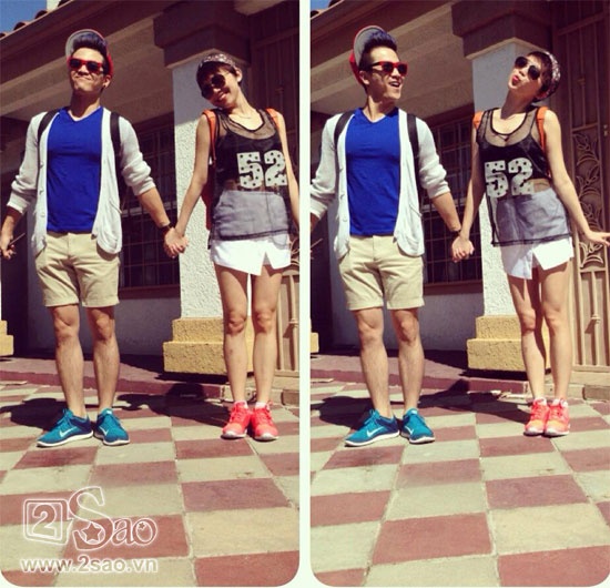 | Phong cách năng động, khỏe khoắn thường thấy ở Hoàng Thùy là áo phông họa tiết, quần short và giày thể thao. |