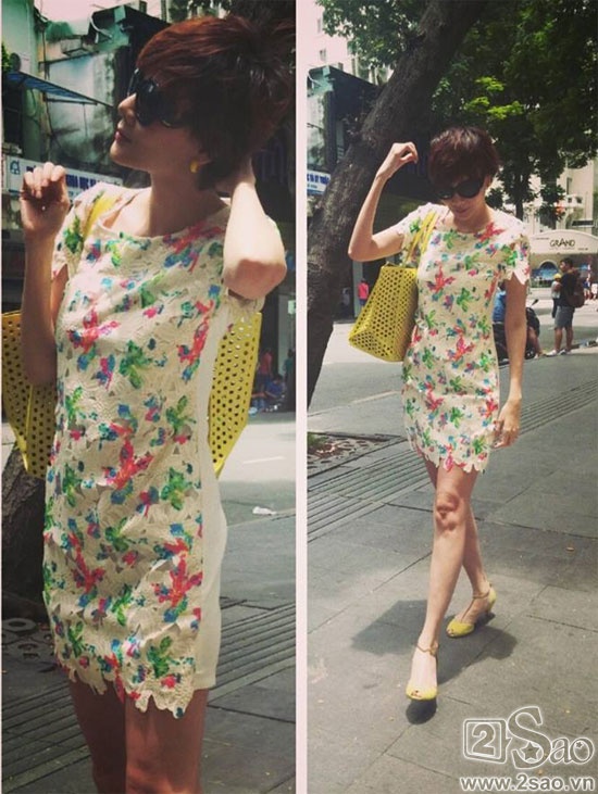 | Dương Yến Ngọc xuống phố trẻ trung với váy hoa. Cô cũng khéo mix túi xách và sandals cùng tông vàng nổi bật. |