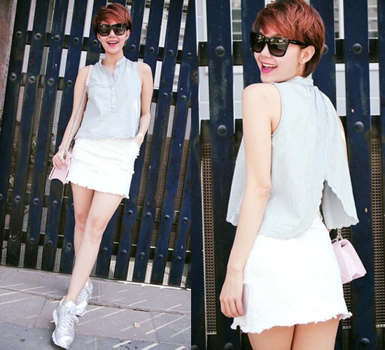 Minh Hằng khoe vẻ đẹp khỏe khoắn và không kém phần gợi cảm với áo sơ mi cách điệu, chân váy ngắn và giày thể thao. |