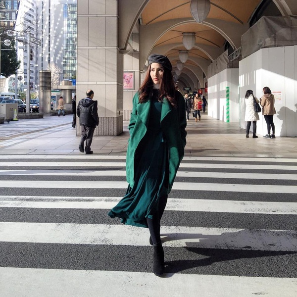 Diễm My chọn tông màu xanh rêu thời thượng để xuống phố. Mũ nồi, boots được chân dài 9x chọn cùng tông với nhau. |