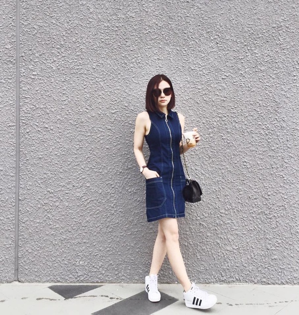 Thu Thủy khoe vẻ đẹp trẻ trung, khỏe khoắn với váy denim sát nách mix cùng giày thể thao trắng. |