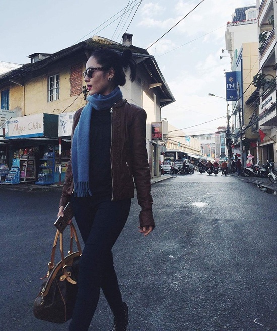 Dạo chơi Đà Lạt, Phương Linh chọn set đồ đơn giản, năng động là áo thun quần jean khoác ngoài là áo da dáng ngắn. Chiếc túi xách hàng hiệu |