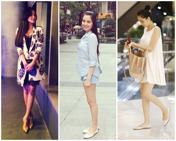 | Khác với Ngô Mai Trang, Khánh Thi không đi giày cao gót mà chọn dép xỏ ngón hoặc giày đế bệt. |