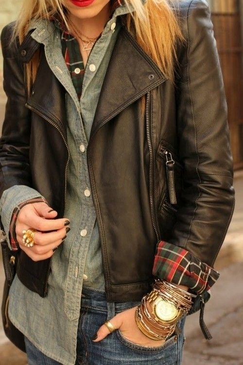 4. Quần jeans và áo khoác da: Sự kết hợp này dành cho những cô nàng có dáng người cao và thích nổi bật. Mang bốt hoặc giày cao gót, xắn gấu quần lên cao mắt cá chân sẽ giúp bạn thêm cá tính. Ngoài màu đen, bạn có thể chọn kiểu áo khoác da màu sắc khác như nâu. |
