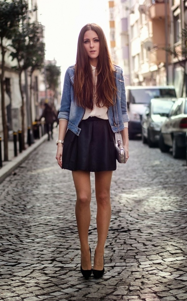 3. Chân váy da và áo khoác denim: Bạn sẽ trở nên vô cùng thanh lịch và khỏe khoắn ngay cả khi đến công sở hoặc đi chơi cùng bạn bè. Bạn có thể kết hợp chân váy xòe, chân váy chữ A hoặc chân váy ôm. Một chiếc túi đeo chéo và giày cao gót sẽ là sự phối hợp ăn ý. |