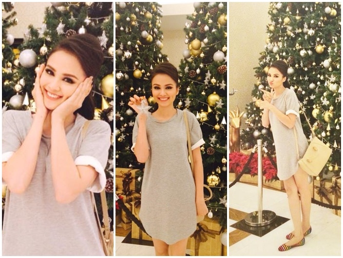 | Hoa hậu Diễm Hương dạo phố dịp Noel với trang phục hết sức đơn giản, áo thun dáng dài phủ quần và túi xách bình dân tạo hình ảnh dễ gần, thân thiện. |