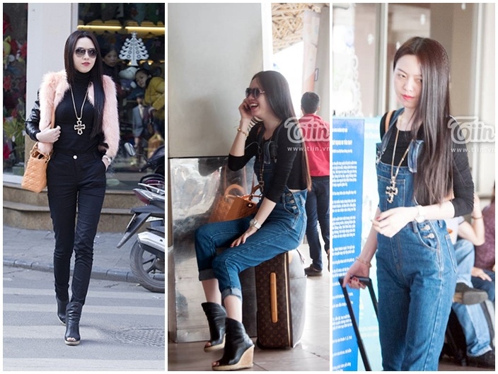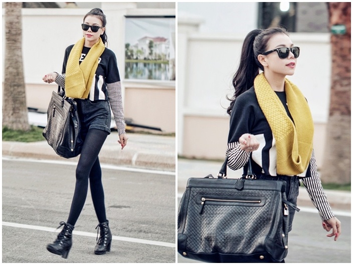 | Trà Ngọc Hằng cũng dần khẳng định hình ảnh ngôi sao mặc đẹp của showbiz khi cô biết cách chăm chút gu thời trang street styles hơn trước. Thông thường, người đẹp chọn gu gợi cảm, nóng bỏng với chân váy ngắn, áo ôm sát, nhưng về mùa đông, cô khéo kết hợp áo thun tay dài, quần short ngắn cùng legging. |