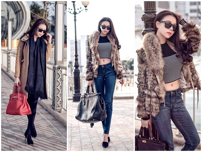 | Hình ảnh hiện đại, sành điệu được Trà Ngọc Hằng duy trì với cách kết hợp cùng áo khoác chất dạ và lông quí phái. |