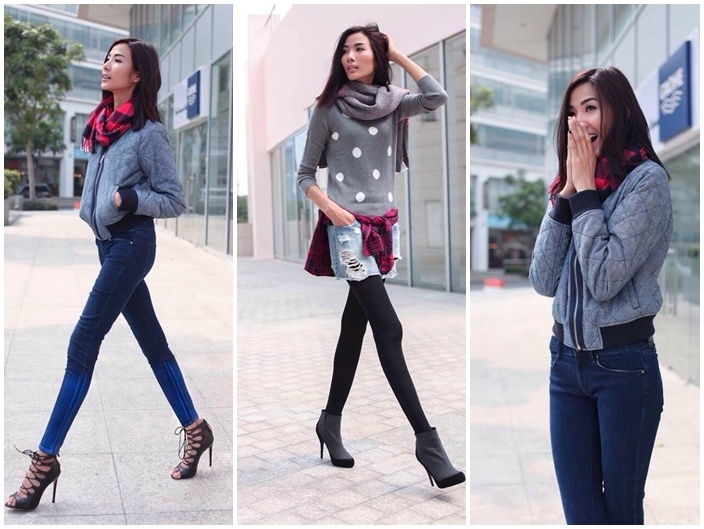 | Ngoài ra, quán quân Vietnam's Next Top Model mùa 2 còn thể hiện sự năng động với áo len ấm áo kết hợp cùng quần jeans ôm sát và áo khoác chần bông hiện đại. Chân dài chứng minh cô không chỉ lộng lẫy và xinh đẹp trên sàn diễn thời trang mà ở đời thường, nữ người mẫu còn là một icon thời trang mà giới trẻ ngưỡng mộ. |