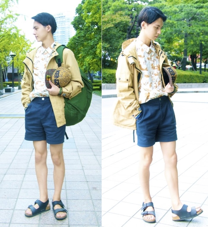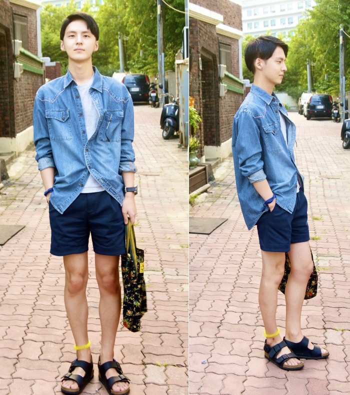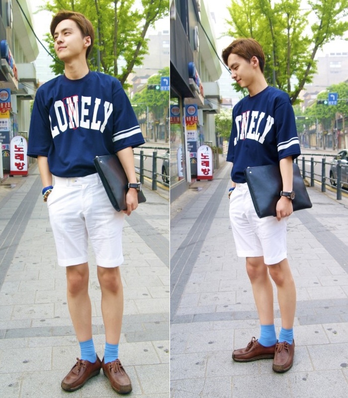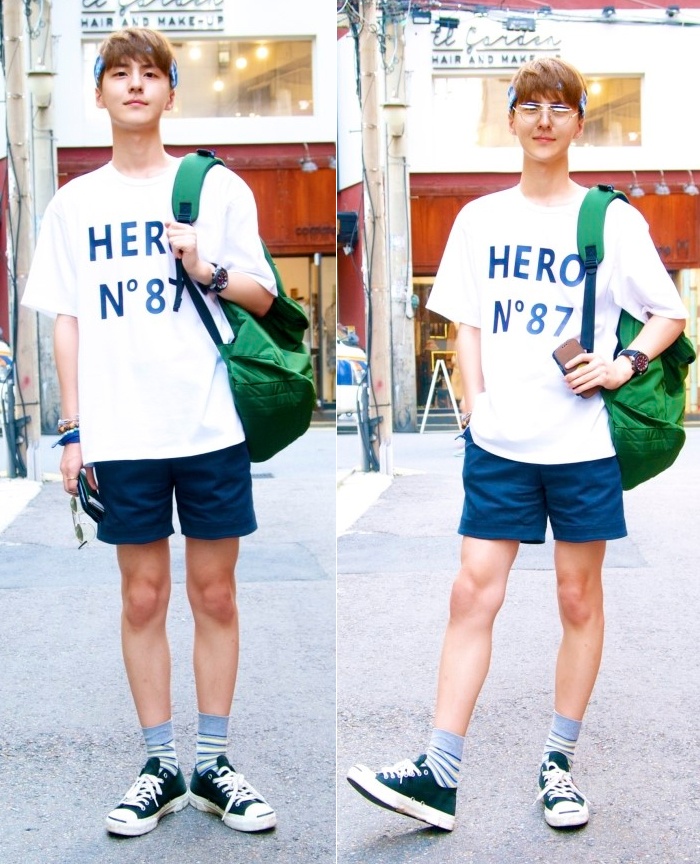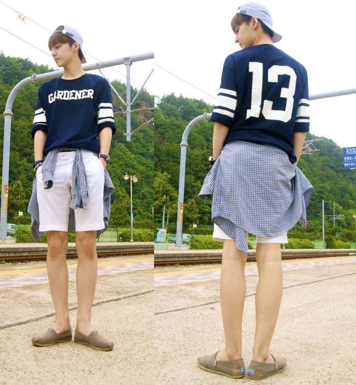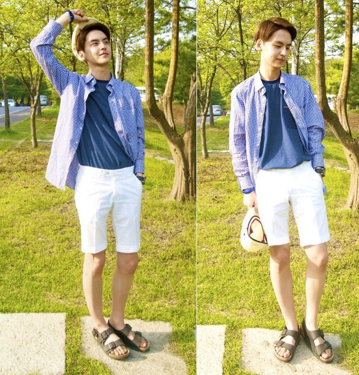| Một ngày cuối tuần đơn giản với quần short trắng, áo phông và sơ mi thả cúc. |