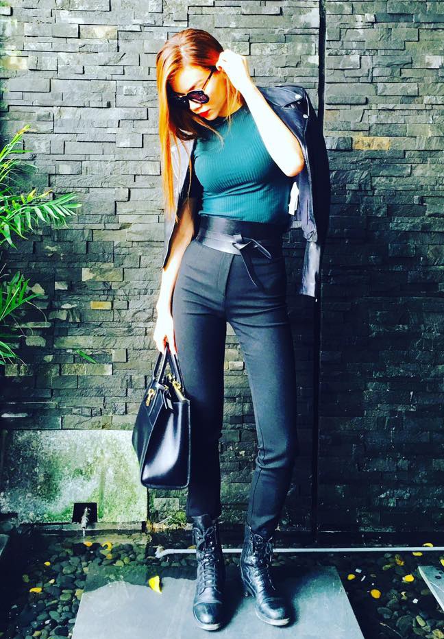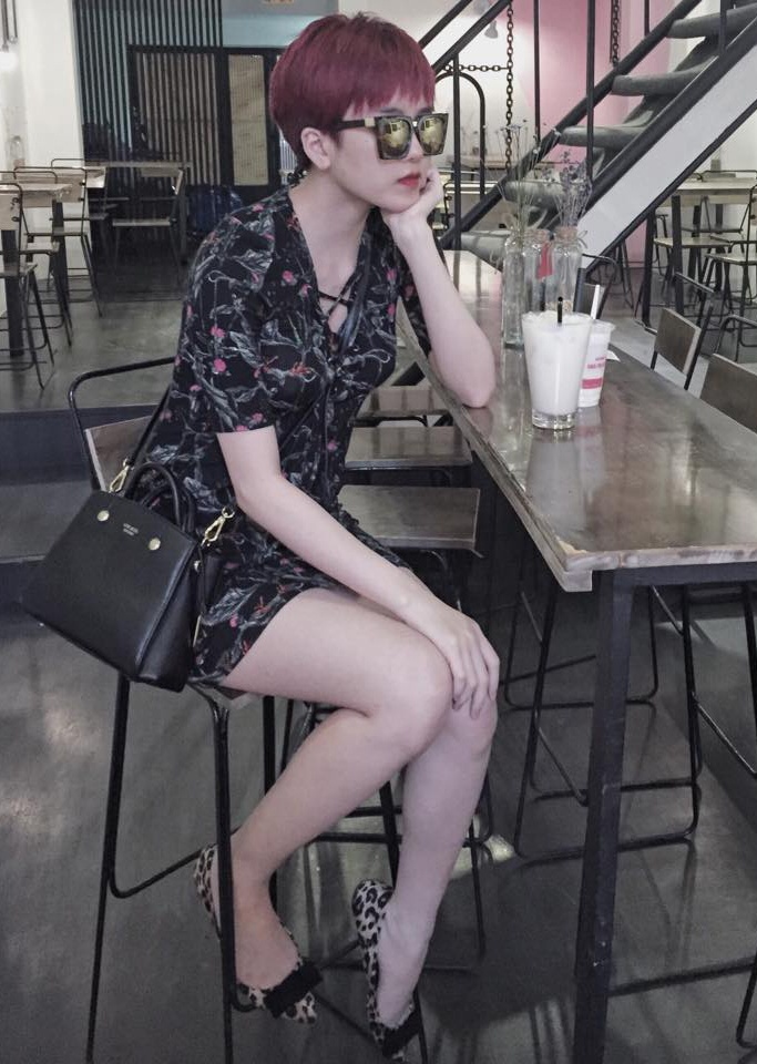 | Văn Mai Hương thể hiện gu thời trang thanh lịch và không kém phần cá tính với bộ cánh tông đen. Áo thun crop-top khoe eo thon. Giày cá tính ton sur ton cùng tổng thể. |