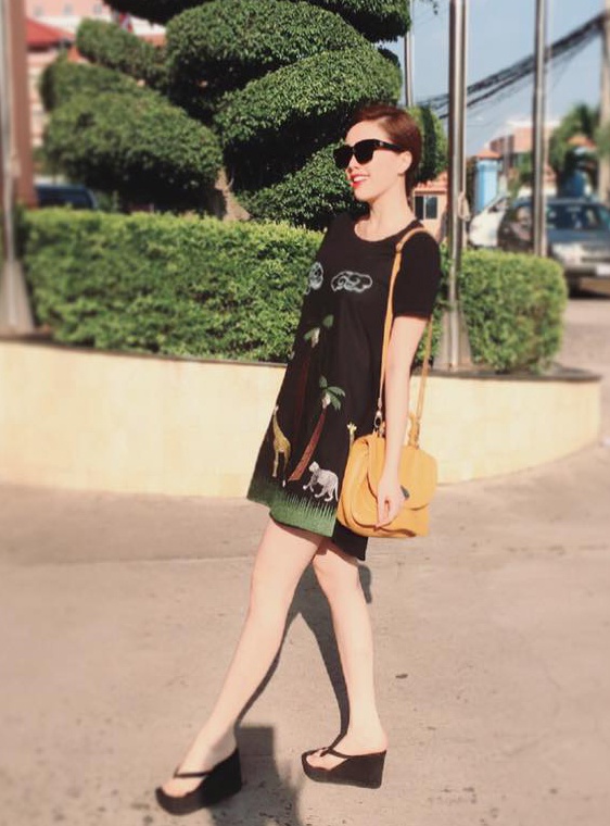 | Trong khi đó, Thanh Hằng nhẹ nhàng và duyên dáng trong bộ đầm họa tiết hoa trắng đen. Thiết kế dáng suông, hạ eo mang đến sự thoải mái cho người mặc. Siêu mẫu đi giày gam xám cùng túi xách hiệu tông màu bắt mắt. |