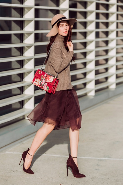 | Trên đường phố Sài thành, Diễm My 9X diện bộ cánh mùa thu nữ tính nhẹ nhàng. Cô mix áo len mỏng cùng chân váy voan xếp tầng điệu đà. Giày phá cách tiệp sắc độ. |