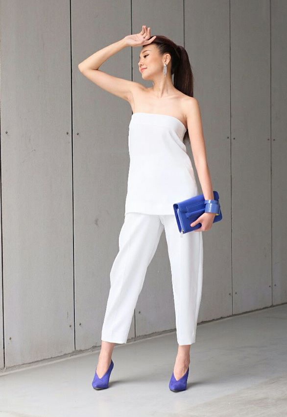 | Thanh Hằng diện set đồ trắng, áo quây gợi cảm khi xuống phố Sài thành. Phụ kiện túi, vòng tay, giày gam xanh da trời nổi bật. |
