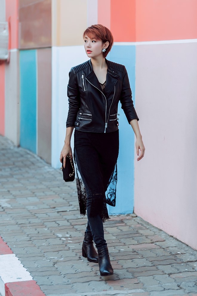 | Minh Hằng đổi style với bộ cánh jeans, jacket da, quần jeans tối màu. Mái tóc tém nhuộm màu đỏ cam cá tính hợp với bộ cánh bụi phủi. |