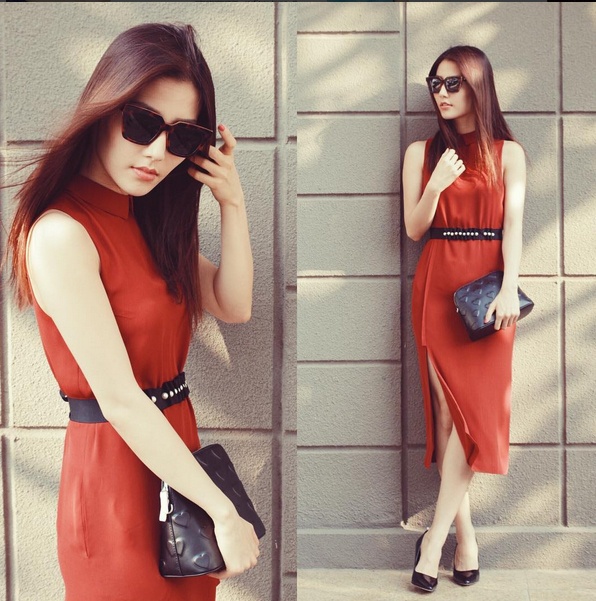 | Diễm My 9X khoe dáng yêu kiều khi diện váy voan mỏng gam màu nóng. Thắt lưng và phụ kiện họa tiết trái tim in nổi làm điểm nhấn. |