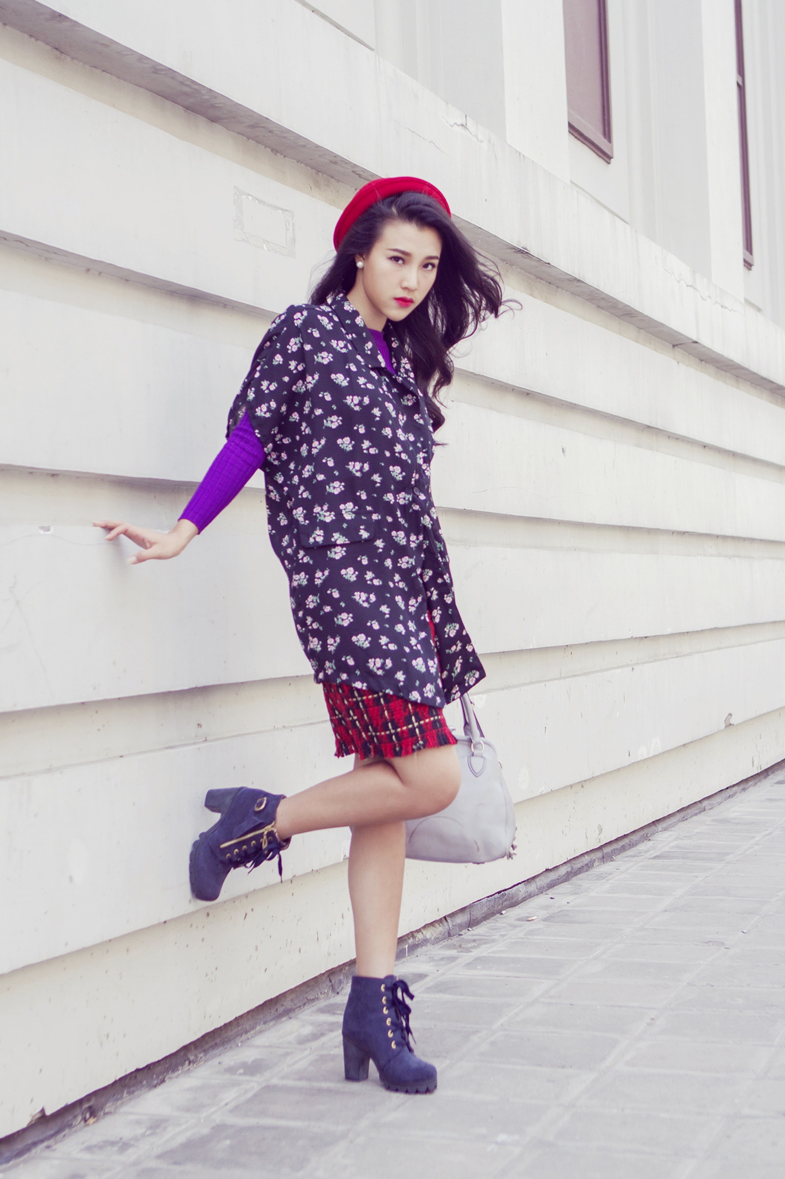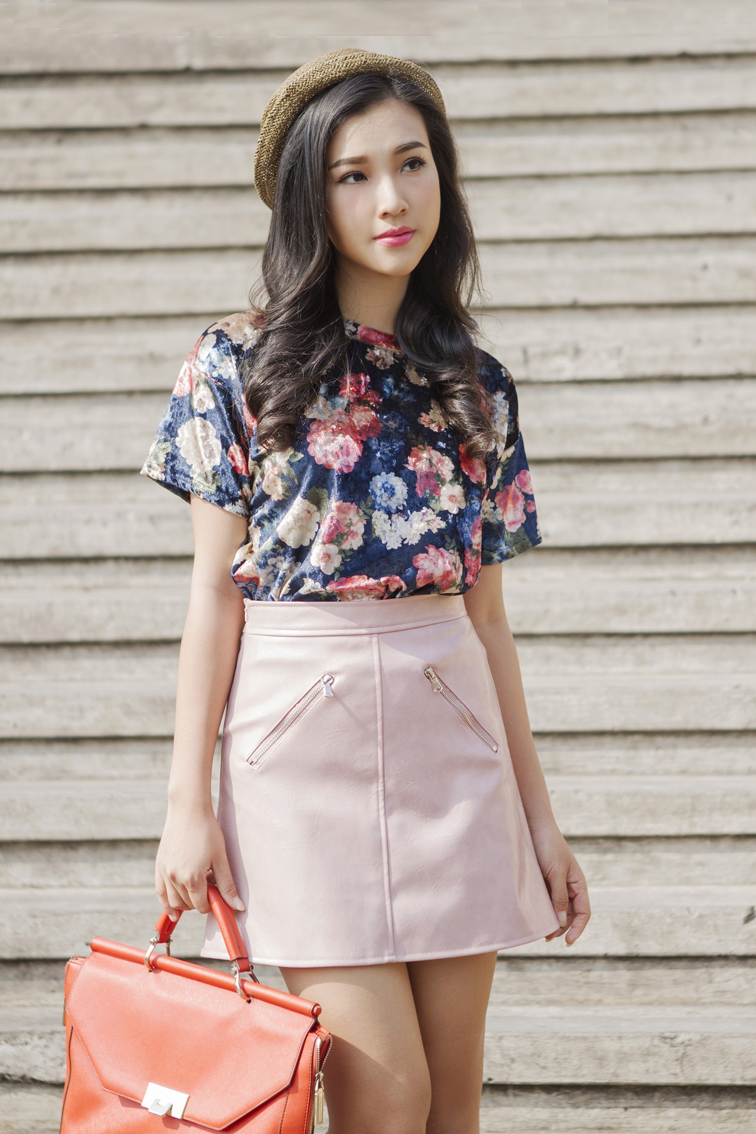 | Lần này, bạn gái diễn viên Huỳnh Anh trông khá nhẹ nhàng và trẻ trung khi diện những bộ cánh nữ tính, áo in họa tiết hoa cổ điển mix phá cách cùng chân váy da màu hồng pastel. |