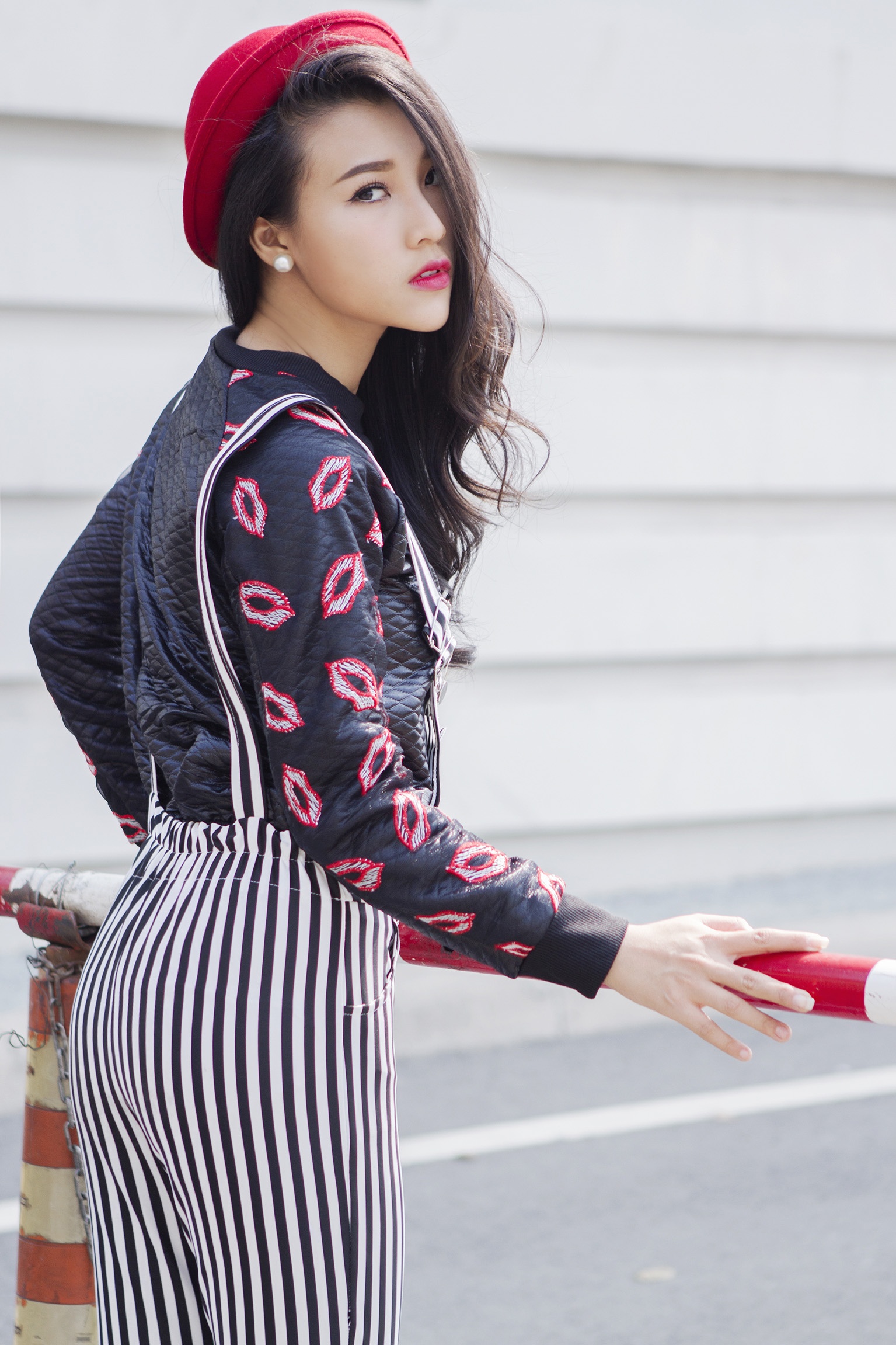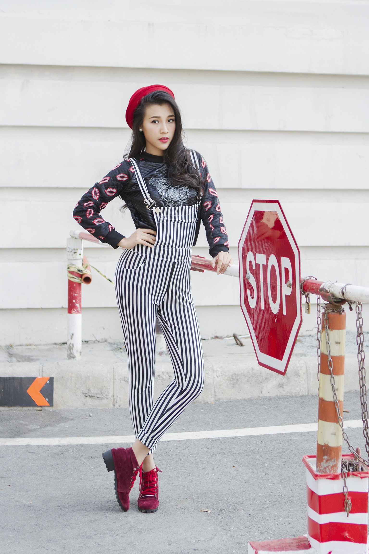 | Nữ MC cũng không kém phần phá cách khi diện quần yếm, áo nỉ họa tiết đôi môi nghịch ngợm. Phong cách cá tính phù hợp khi xuống phố mùa se lạnh. |