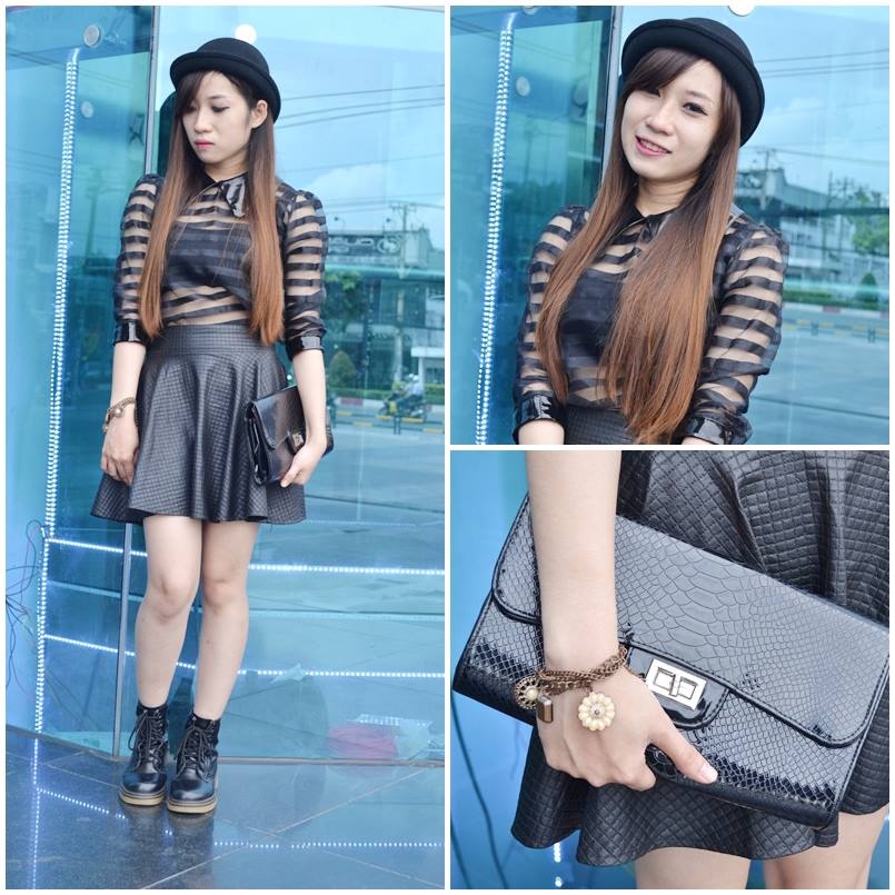 | Với tone màu đen cô bạn chọn cho mình chiếc váy da phối với áo xuyên thấu giúp chủ nhân trở nên cá tính và hiện đại. |