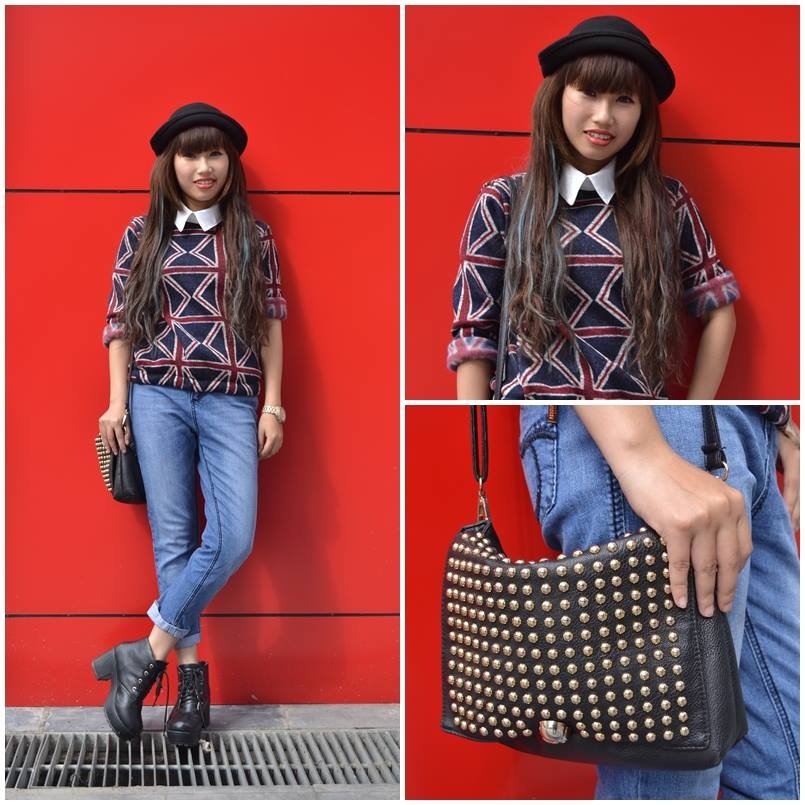 | Jeans xanh đơn giản + áo len họa tiết lạ + boots + túi đính tán là sự lựa chon hoàn hảo. |
