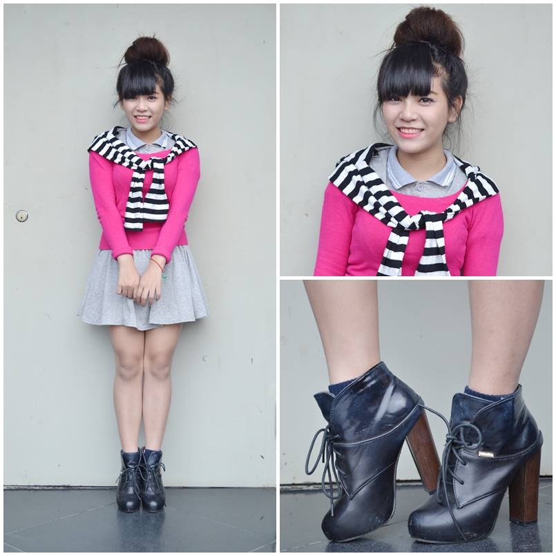 | Mặc dù đang khoác trên mình chiếc váy thể thao nhưng cô bạn này vẫn trong điệu đà khi kết hợp với áo len hồng kèm theo điểm nhấn là họa tiết sọc trắng đen và không quên đôi boots thật cá tính. |