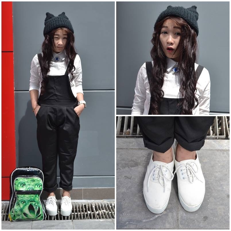 Một lần nữa tone màu trắng-đen lại thu hút những những cô gái cá tính khi kết hợp yếm + T-shrit + giày bánh mì và chiếc nón len tai mèo đang là hot iem mùa này.