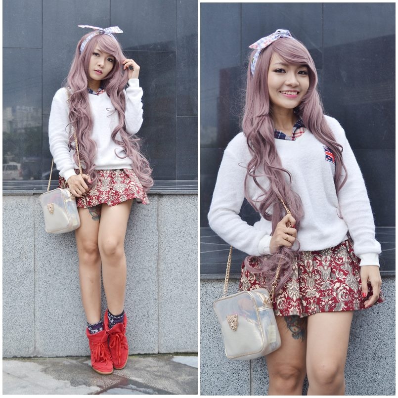 Chân váy họa tiết và chiếc sơ mi cùng tone màu đỏ khi phối thêm chiếc áo len trắng giúp trang phục dịu lại và bớt chói là lựa chọn khá thông minh. Với màu tóc ấn tượng cô bạn này thật nổi bật giữa đám đông