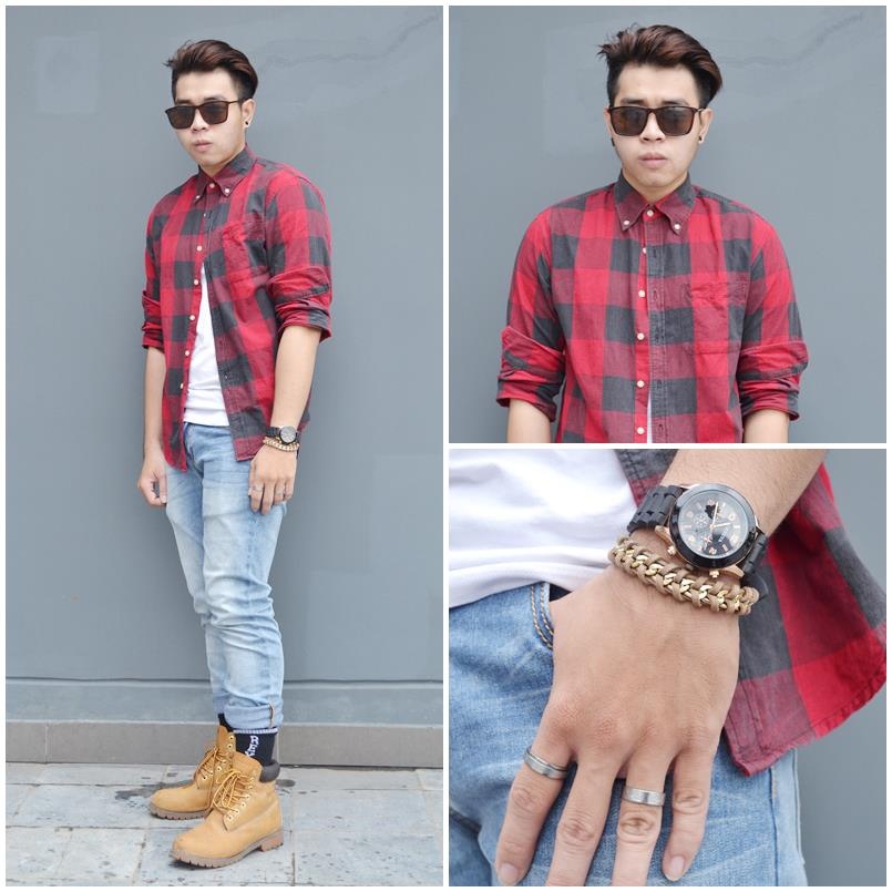 | Caro đỏ không chỉ hút hồn phái đẹp, các anh chàng cũng rất thích sự kết hợp đầy cá tính và "punk" này. Với sơmi caro đỏ phối bên ngoài vời chiếc áo denim, quần jeans xanh cơ bản cùng một đôi boots - anh chàng trẻ trung năng động đã có một set đồ đơn giản nhưng hợp mốt. |