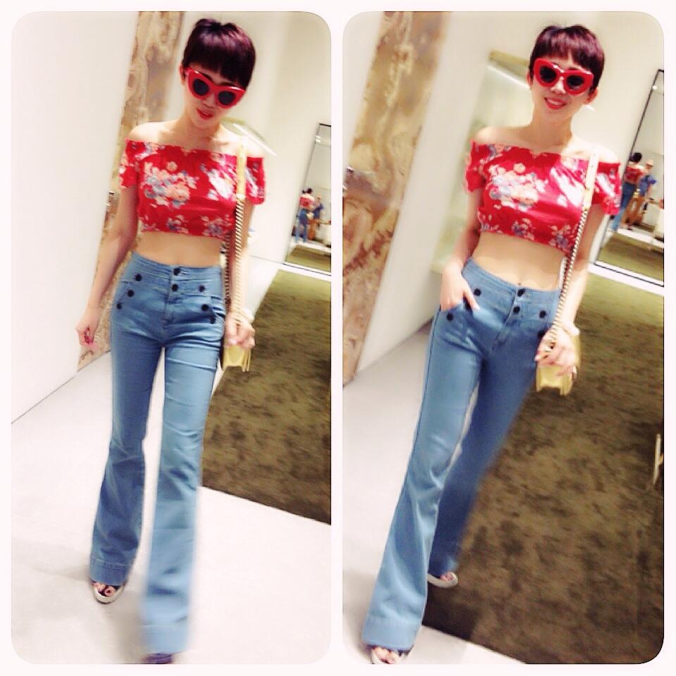 Tuần này, để chống lại thời tiết mùa hè oi bức, nữ ca sĩ Tóc Tiên diện trang phục áo hoa crop-top hiện đại, kết hợp cùng quần jeans ống loe cổ điển. Nữ người mẫu trông sành điệu hơn với kính mát cá tính và túi Boy Chanel ánh vàng.