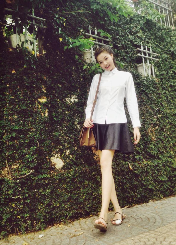 Bạn gái cũ của hot boy Huỳnh Anh - Kỳ Hân khiến người hâm mộ thích thú với hình ảnh trở ''về với tuổi thơ'' khi diện bộ trang phục mang phong cách nữ sinh. Áo sơ-mi trắng căn bản mix cùng chân váy tối màu chất liệu da tạo vẻ đẹp nữ tính, xinh xắn.