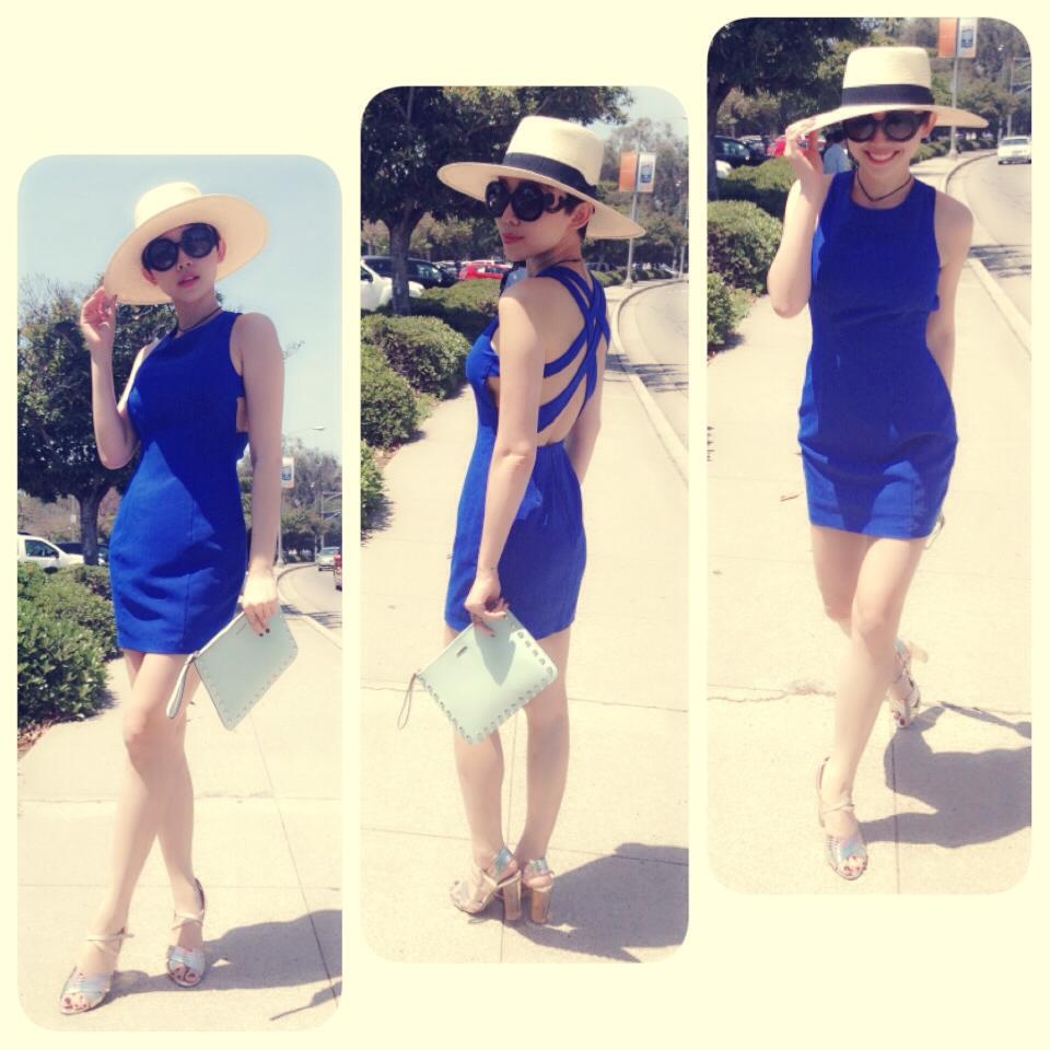 Một ngày khác, cô khoe phong cách ngày hè sexy khi xuống phố với bộ trang phục tông màu xanh nước biển đậm. Bộ váy có khoảng hở sau lưng áo táo bạo. Phụ kiện đi kèm là ví cầm tay màu xanh bạc hà và giày ánh bạc lấp lánh sành điệu.