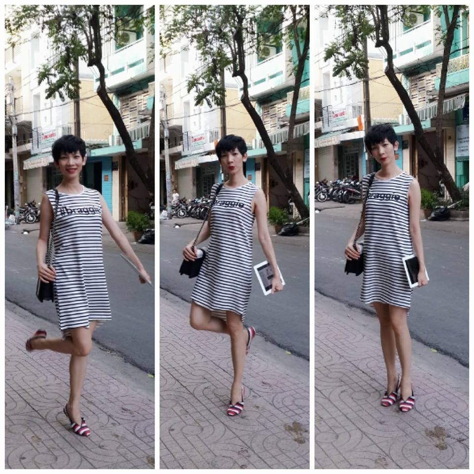 Sở hữu thân hình mảnh mai, bà mẹ một con Xuân Lan tinh nghịch trong mẫu đầm dáng suôn phong cách trẻ trung. Kết hợp cùng là giày đế bệt sọc kẻ màu sắc.
