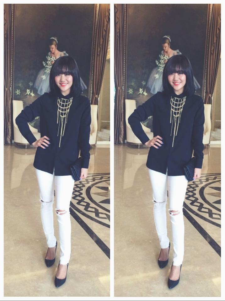 Trong khi các đàn chị khá trẻ trung với trang phục xu hướng hè thì Văn Mai Hương lại già dặn với mẫu áo tông đen cao cổ, phối phá cách cùng quần jeans rách tạo độ trẻ trung.