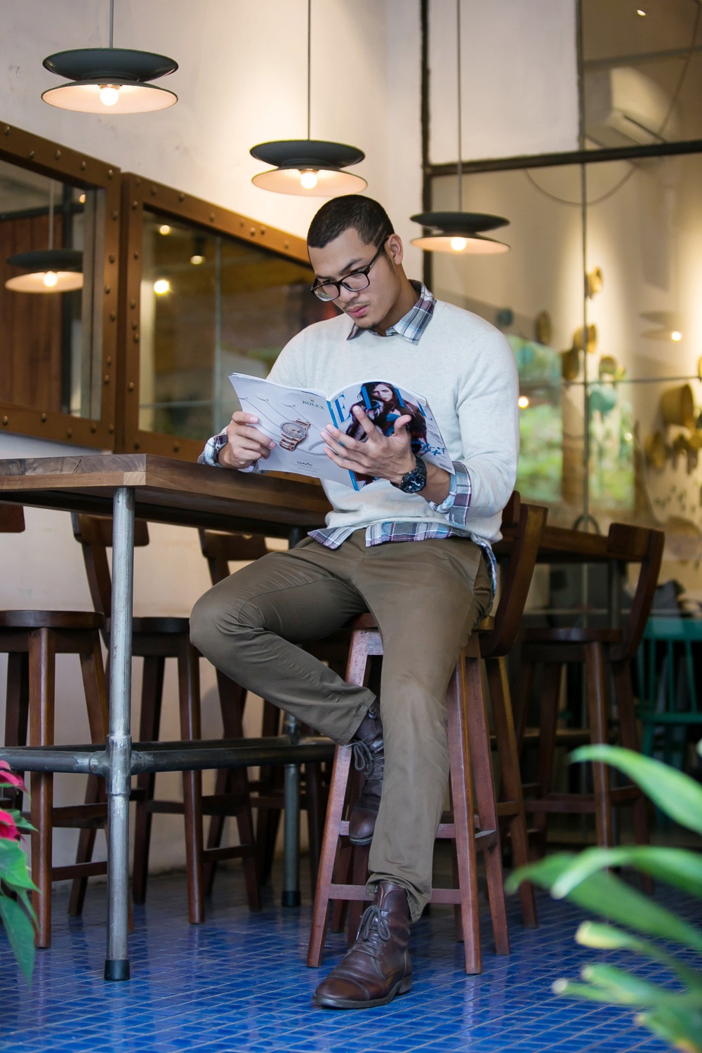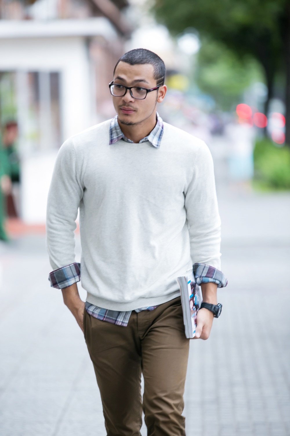 | Diện trang phục xuống phố, nam diễn viên Cú hích trên không muốn được là chính mình. Trang phục anh yêu thích luôn là những item cơ bản như áo thun, áo sơ mi, áo vest, quần jeans và giày hầm hố. |