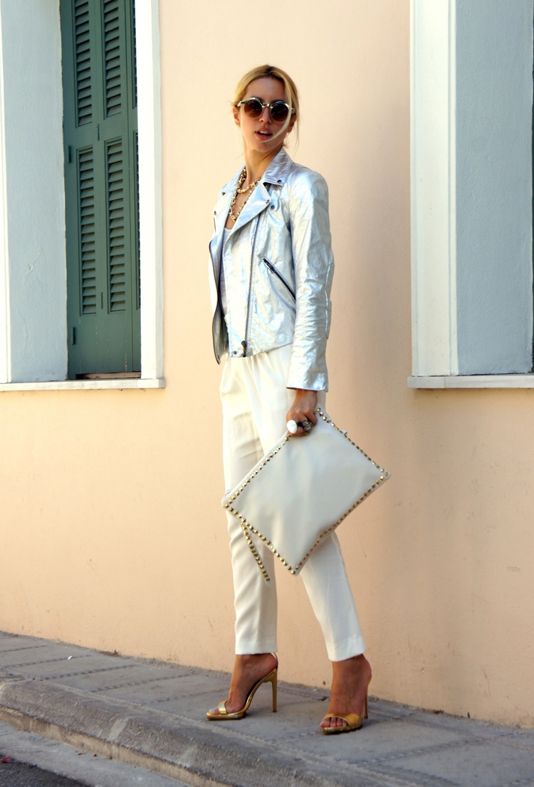 | Hoàn hảo hơn, set đồ kết hợp giày metallic cần có thêm các phụ kiện và trang sức ánh kim như áo khoác, clutch, dây đeo tay, vòng cổ. |