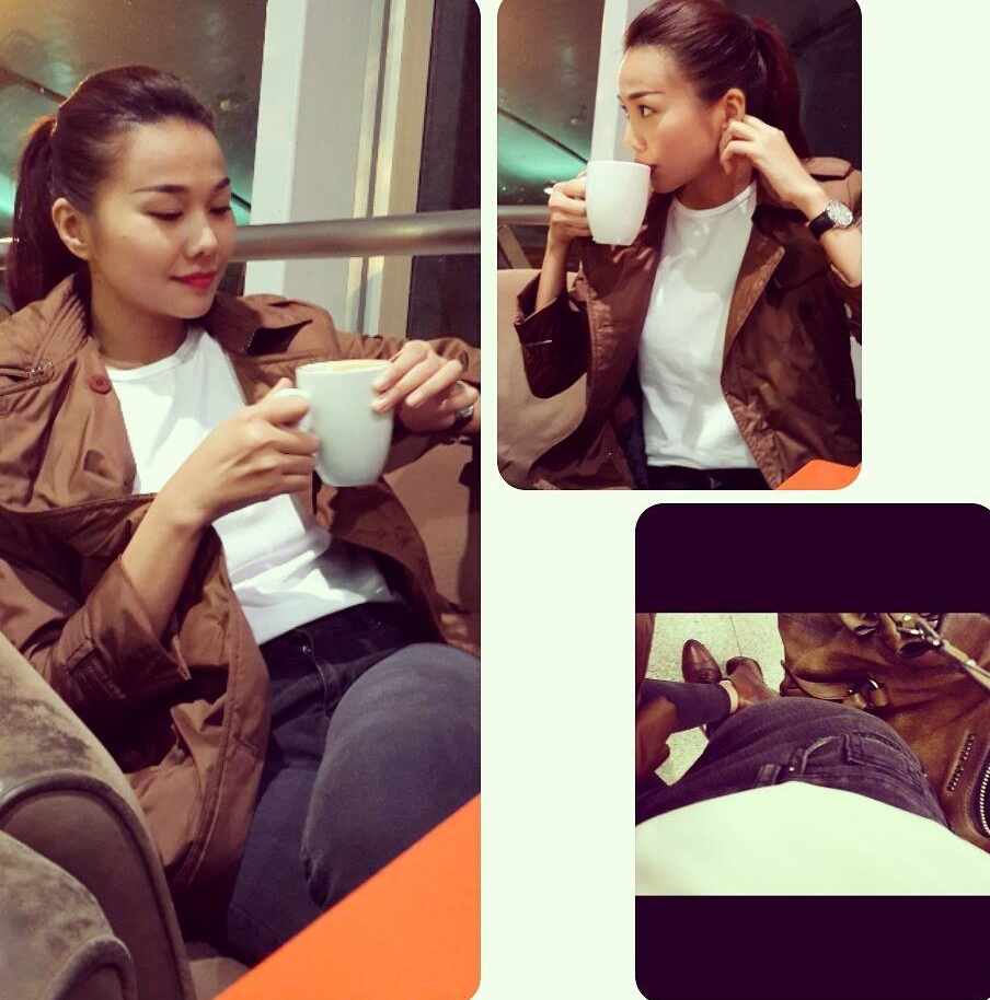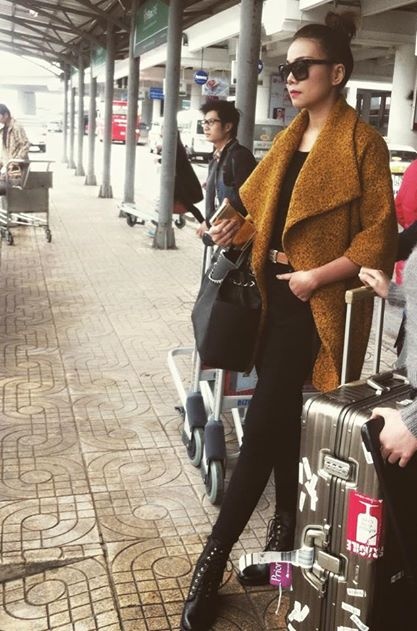| Một dịp khác, khi đáp chuyến bay sang nước ngoài công tác, chân dài trông sành điệu với mốt áo len măng-tô ấm áp. Bộ cánh năng động với quần jeans bó sát và bốt phủi bụi. |