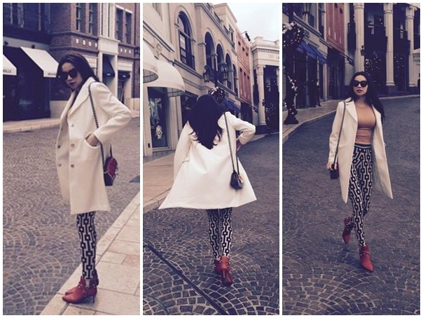 | Khi có chuyến lưu diễn châu Âu, Hồ Ngọc Hà không quên ghi lại những hình ảnh mới khi sải bước trên những con phố cổ kính nổi tiếng thế giới. Trong ảnh, bà mẹ một con nổi bật với set trang phục phá cách. Quần họa tiết mix ăn nhập cùng áo thun và áo khoác măng-tô màu trắng lịch thiệp. |