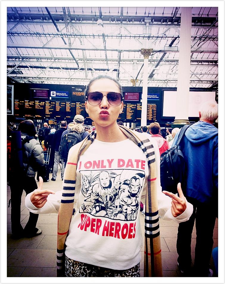 | Hoa hậu Ngọc Hân dạo phố London với phong cách cá tính, trang phục tông màu đen với biker jacket mạnh mẽ, mũ rộng vành và kính mắt sành điệu. |