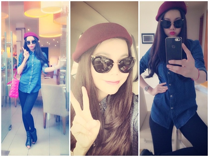 | Trà Ngọc Hằng diện áo denim cá tính chấm bi nhỏ, legging ôm sát, boot cổ ngắn hở mũi, mũ bê rê tông màu hồng hợp tông với túi Dior. |