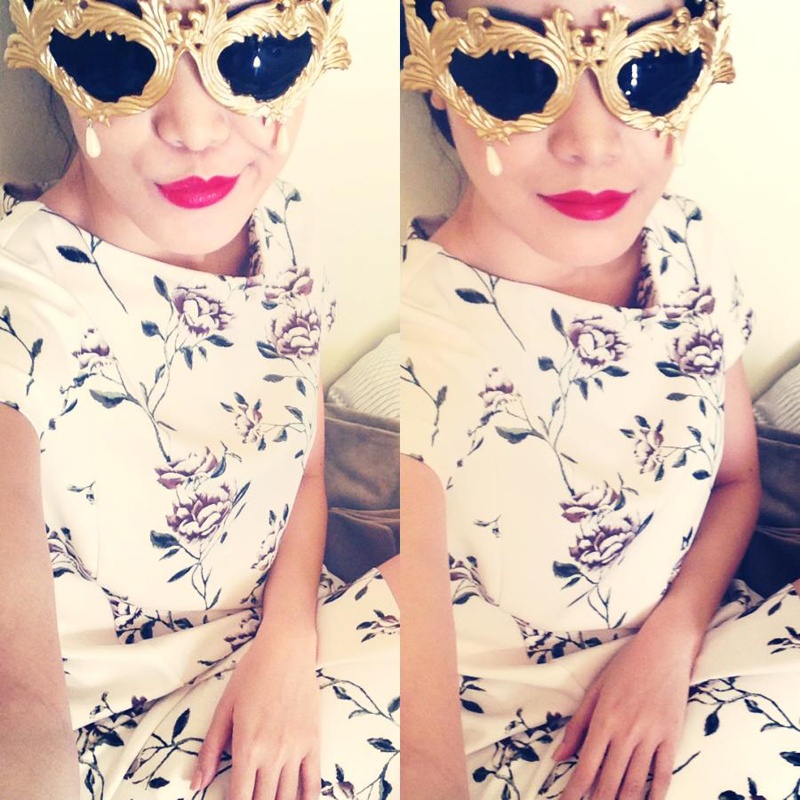 | Thùy Dung nhã nhặn với váy in hoa gam màu trắng, hoa hậu tỏ ra sành điệu với kính mắt cá tính. |