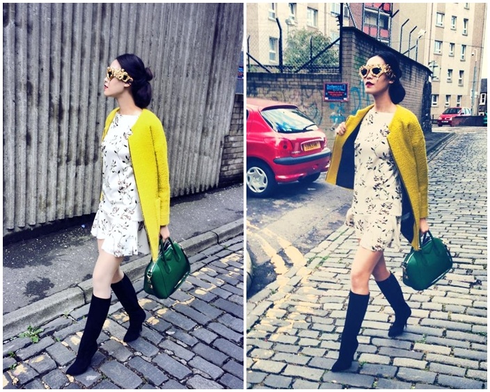 | Cô khoác thêm chiếc áo vest dáng dài tông màu vàng khi dạo phố tại châu Âu, túi xách LV tông màu xanh lam đậm ăn nhập với tông màu trang phục. |