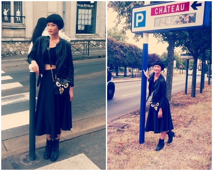 | Kha Mỹ Vân ấn tượng trên phố London với gu thời trang cá tính, cô chọn tông màu đen cho tổng thể phong cách, boots cổ ngắn và túi xách mặt cú rất mạnh mẽ. |