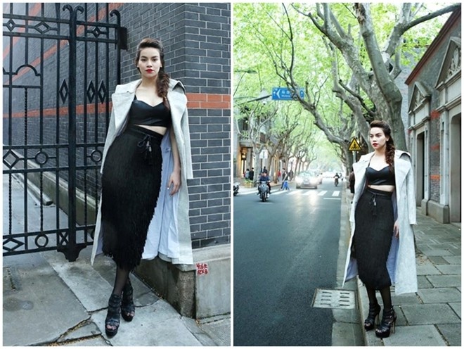 Bên cạnh việc diện đẹp khi xuất hiện tại các sự kiện trong nước, ''nữ hoàng giải trí'' còn mặc rất phong cách khi có chuyến công tác tại nước ngoài. Trong dịp sang Thượng Hải tham gia show diễn của NTK Kelly Bùi, bà mẹ một con thể hiện cá tính thời trang khi chọn bộ trang phục áo bra-top, chân váy tua rua phá cách, nổi bật một góc phố.