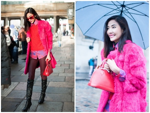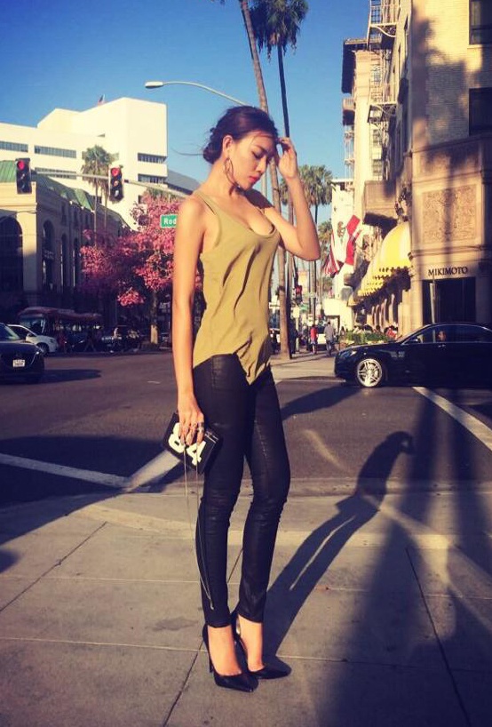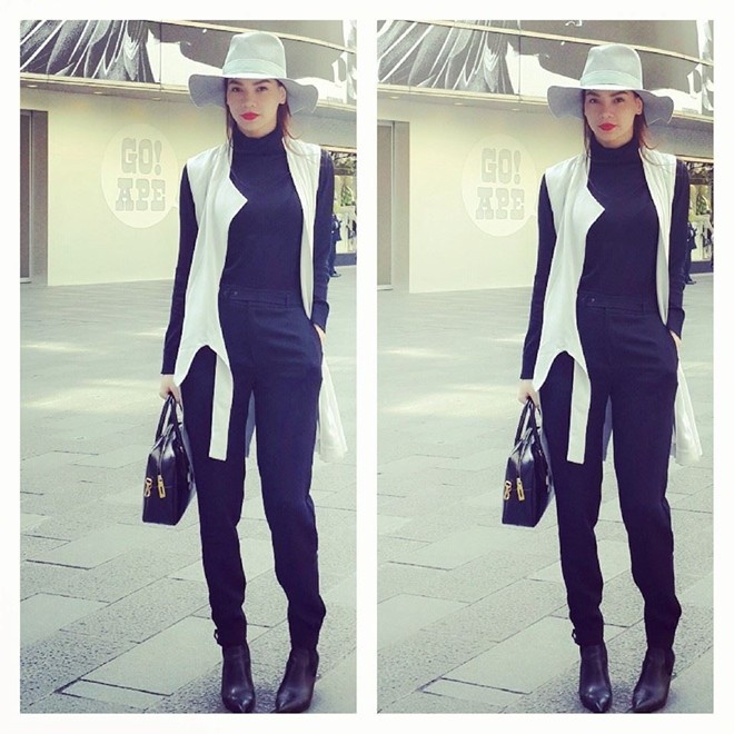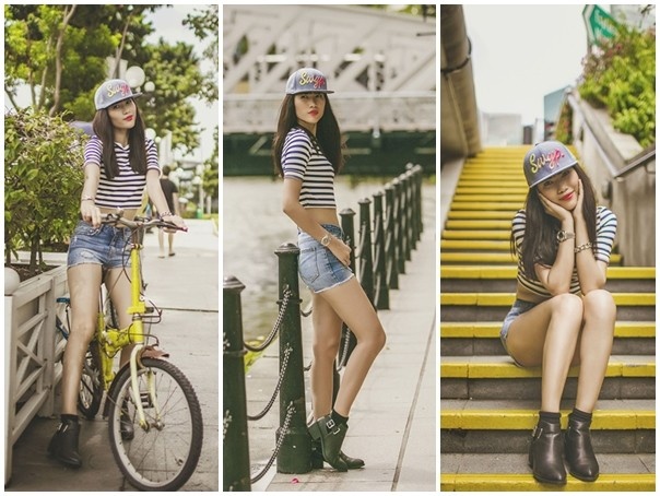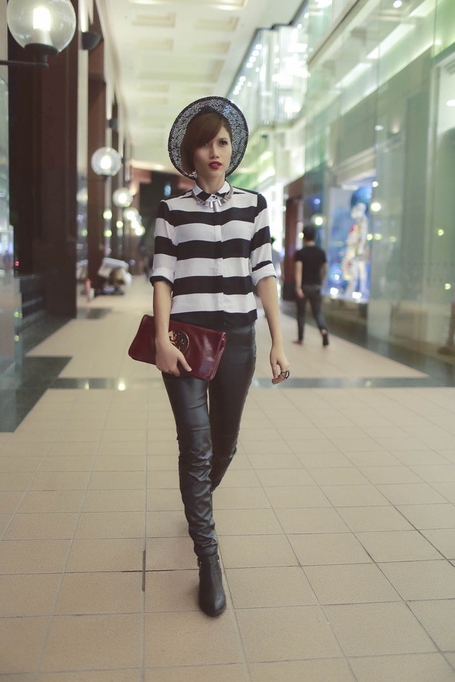 Khi tham dự show diễn thuộc Tuần lễ thời trang Singapore, nữ người mẫu văn vận cá tính với mốt áo sơ-mi sọc kẻ, quần leggings da bóng. Mũ fedora và clutch cổ điển ăn nhập hình ảnh sành điệu.